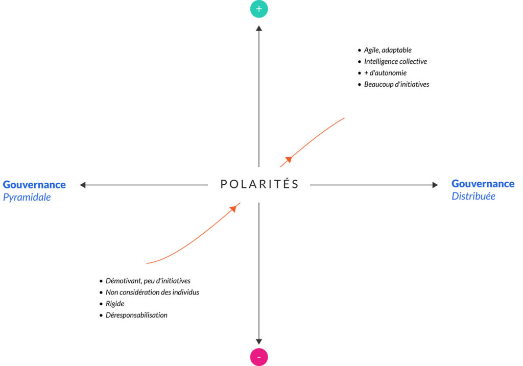 Prenons l’exemple du management dans les entreprises. Visualisons deux polarités que sont le management directif (la structure verticale de pouvoir) et le management participatif (faisant davantage appel à l’intelligence collective et aux équipes autonomes).