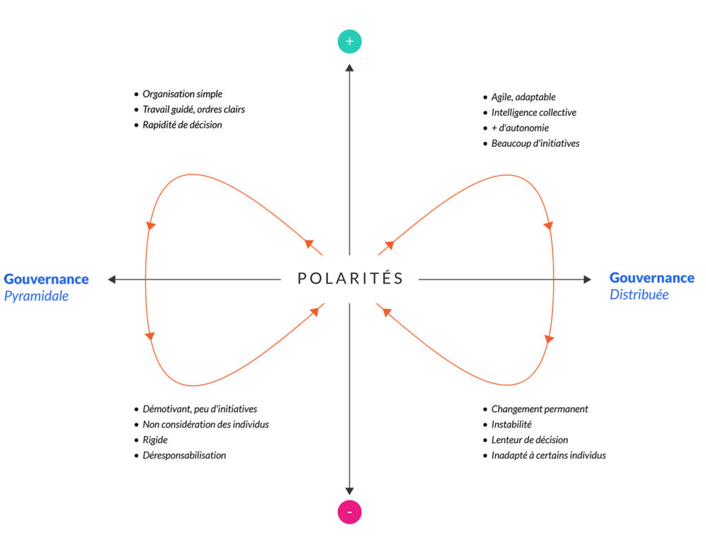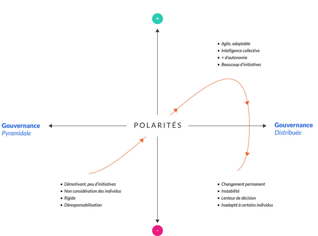 L’idée n’est pas de se situer dans un entre-deux qui ne serait ni l’une ni l’autre, mais bien de savoir naviguer entre ces deux polarités en allant chercher chez chacune ce qu’il y a de plus fonctionnel. La gestion des polarités fonctionne si et seulement si l’entreprise apprend à détecter très rapidement la manifestation de la facette dysfonctionnelle de l’une des polarités pour très vite aller chercher du côté opposé l’inspiration qui viendra compenser ce manque.