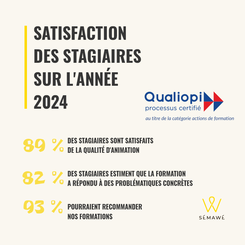 Sémawé est un Organisme de Formation certifié Qualiopi depuis juillet 2020 au titre des actions de formation. Depuis cette date, nous renouvelons notre certification sans non-conformité.